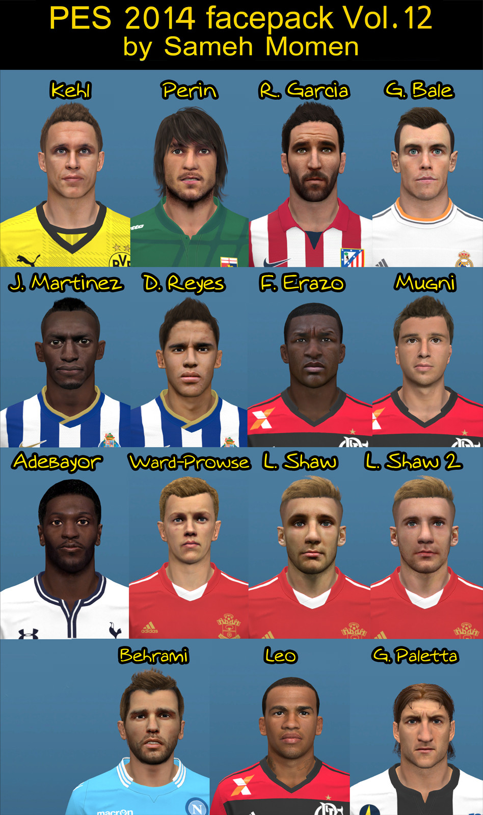 PES 2014 Facepack vol.12 by Sameh Momen April 16, 2014 PES 2014 Facepack vol.12 Previews: Including: Kehl, Perin, R.Garcia, G.Bale, J.Martinez, D.Reyes, F.Erazo, Mugni, Adebayor, Ward-Prowse, L.Shaw, L.Shaw 2, Behrami, Leo, G.Paletta Download links for PES 2014 Facepack vol.12: